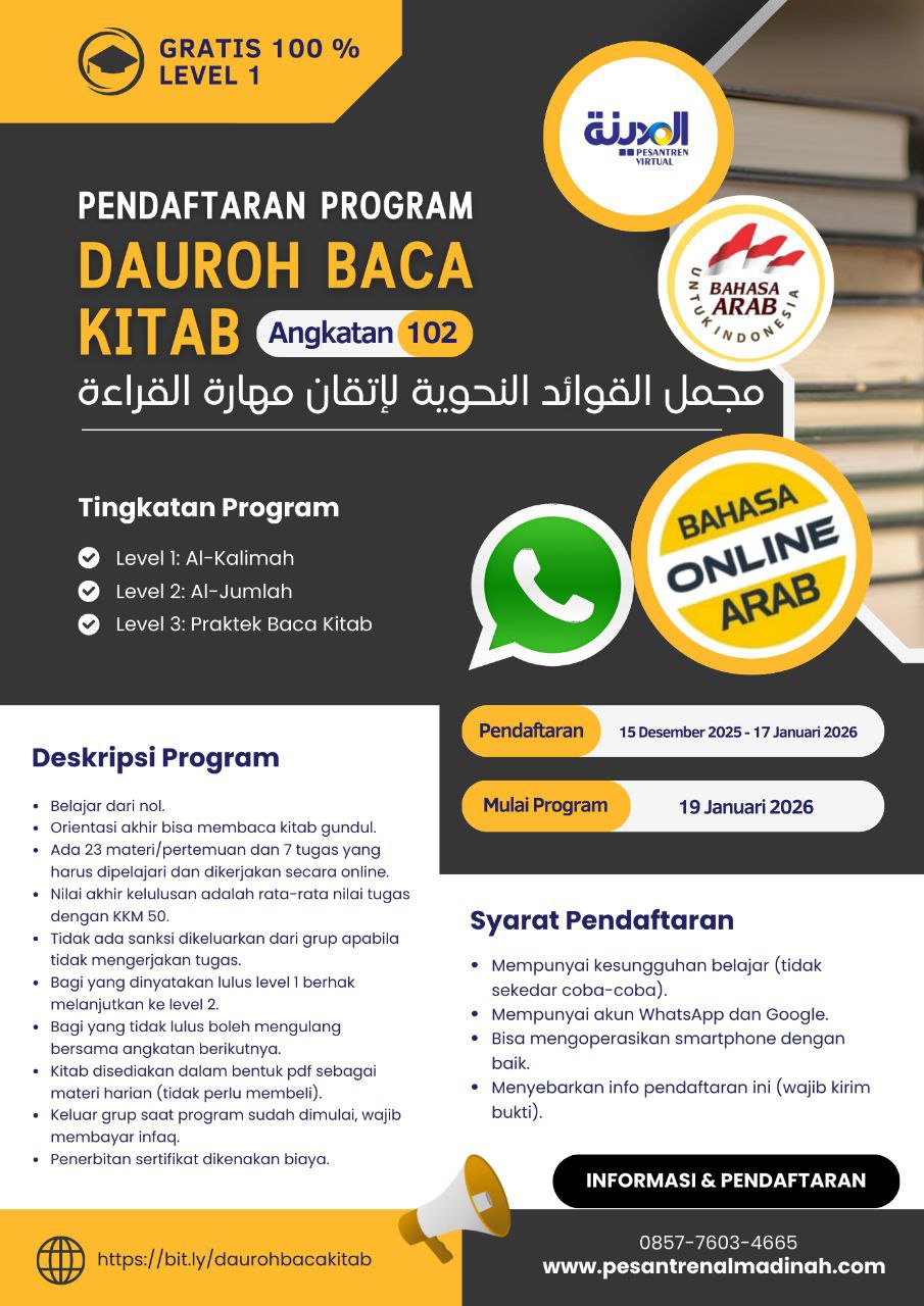 Bismillahirrahmanirrahim. Dengan karunia Allah ta’ala, Pesantren Virtual Bahasa Arab Al-Madinah kembali membuka pendaftaran Dauroh Baca Kitab Angkatan 102 (Level 1) ONLINE via whatsapp, membahas kitab مُجْمَلُ القَوَاعِدِ النَّحْوِيَّةِ لِإِتْقَانِ مَهَارَةِ القِرَاءَةِ karya Ustadz Abu Unais Abdurrohman Siddiq hafizahullah taala. Program ini tidak dipungut biaya atau GRATIS 100 %.