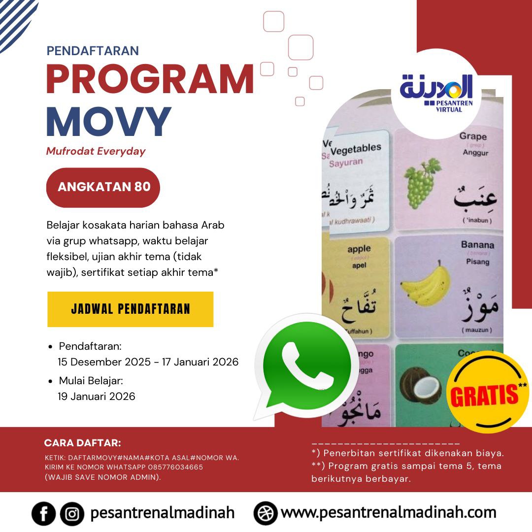 Bismillah. Alhamdulillah, atas karunia Allah ta’ala kembali dibuka pendaftaran program Mufrodat Everyday (MOVY) angkatan 80. Program ini diperuntukkan bagi pemula yang benar-benar awam bahasa Arab dan ingin mengenal bahasa Arab dengan mengenal kata per kata. Bentuk program berupa sharing kosakata harian melalui grup whatsapp, dalam bentuk gambar dan dilengkapi contoh kalimat dalam percakapan. Tidak perlu khawatir atas kesibukan rutinitas, karena program ini tidak ada setoran hafalan dan ujian pun bersifat tidak wajib, sehingga tetap fleksibel untuk semua kalangan.