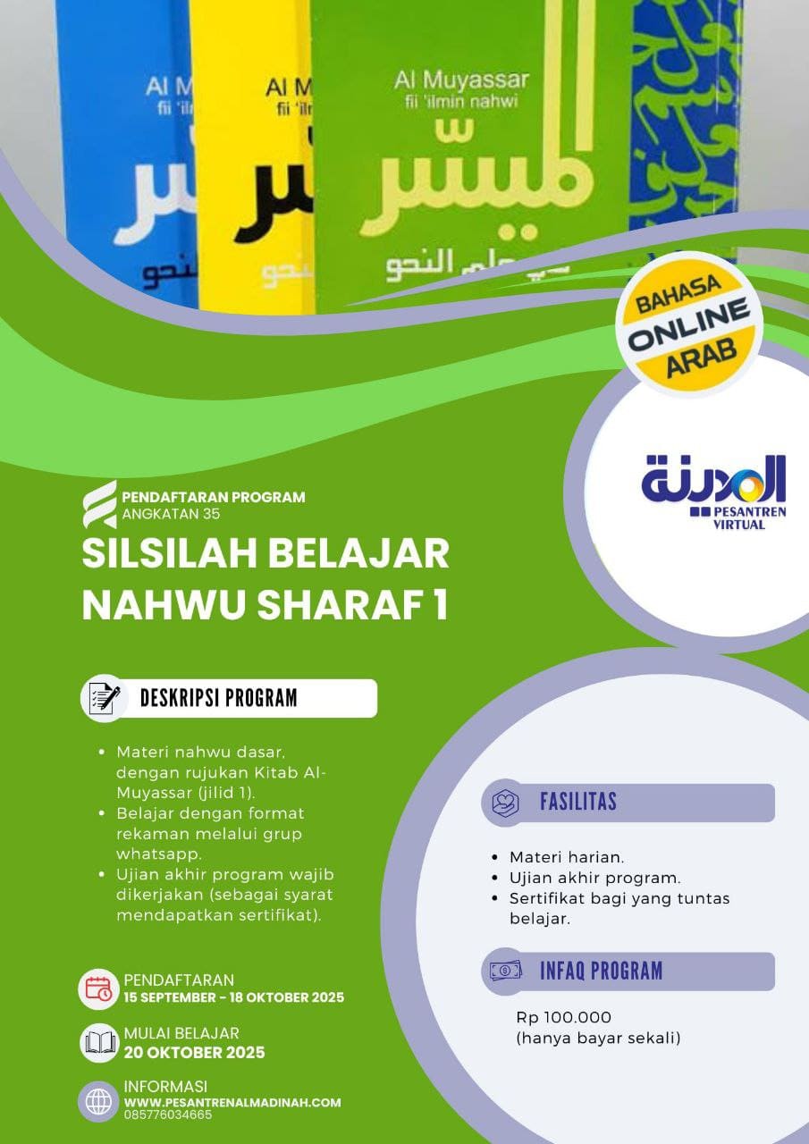 Bismillah. Dengan izin Allah ta’ala Pesantren Virtual Bahasa Arab Al-Madinah kembali membuka pendaftaran program Silsilah Belajar Nahwu Sharaf (SBNS) 1 angkatan 35. Pembelajaran fokus kepada ilmu Nahwu dan Sharaf sebagai dasar dalam penguasaan kemampuan membaca kitab gundul. Kitab yang dipakai belajar adalah Al-Muyassar jilid 1 karya Ustadz Aceng Zakaria. Pembelajaran melalui grup Whatsapp. Apabila telah menamatkan program ini maka pembelajaran insyaallah akan berlanjut sampai tingkatan 6 atau sesuai dengan jumlah kitab yang berjumlah 6. Setiap tingkatan diselenggarakan dalam bentuk kursus singkat selama 20 – 24 hari. Untuk setiap tingkatan dibuka pendaftaran dengan jadwal tersendiri. Info pendaftaran untuk setiap tingkatan dapat menghubungi admin di nomor whatsapp 085776034665 atau dapat dilihat di akun IG Pesantren Al-Madinah atau akun Facebook.