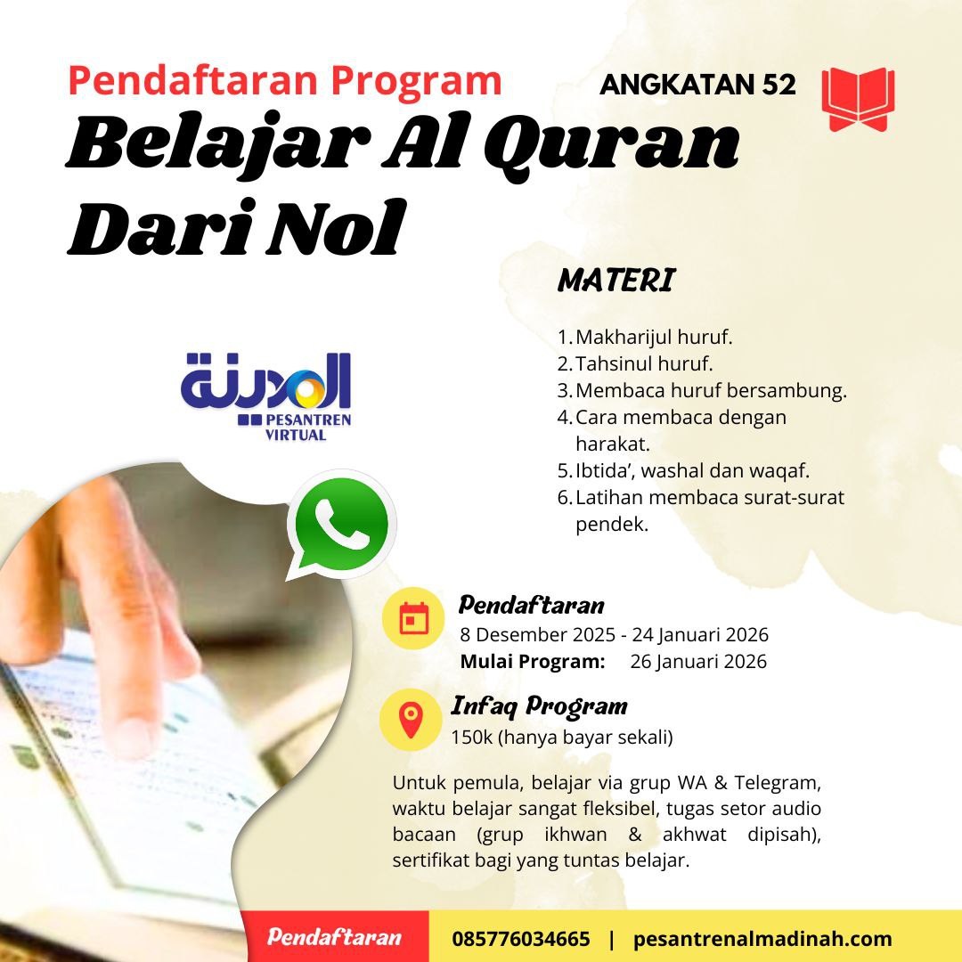 Alhamdulillah, Pesantren Virtual Bahasa Arab Al-Madinah kembali membuka pendaftaran program “Belajar Al Qur’an dari Nol” angkatan 52. Program ini diperuntukkan untuk kaum muslimin yang belum bisa membaca Al Qur’an, atau belum fasih dalam membaca Al Qur’an. Kitab yang akan dipakai belajar adalah Metode Asy-Syafi’i (jilid 1). Sekilas DESKRIPSI PROGRAM: belajar via grup whatsapp dan telegram (bukan melalui Zoom), waktu belajar fleksibel (materi dapat dipelajari kapanpun sesuai waktu luang siswa), ada 20 tugas bacaan yang harus disetor, ada ujian akhir program, sertifikat bagi yang lulus, dan untuk yang belum lulus boleh mengulang (free). Kuota terbatas 30 peserta. Pendaftaran 8 Desember 2025 – 24 Januari 2026, mulai belajar 26 Januari 2026, dengan jumlah materi sebanyak 25 pertemuan (belum termasuk tugas). Berminat daftar? Isi data pendaftaran di http://bit.ly/daftar-pvba dan transfer biaya program ke rekening Bank Muamalat 3050106379 atas nama Abdul Rohman Siddiq (kode transfer antar bank 147), konfirmasi bukti transfer ke WA 085776034665.